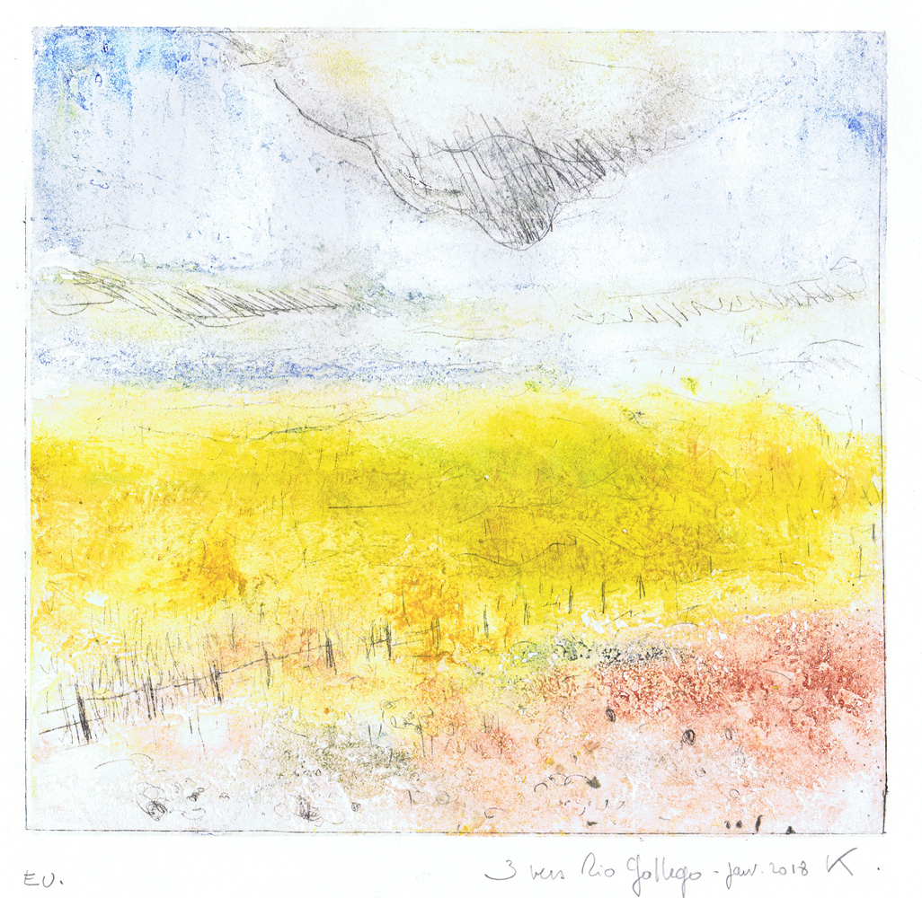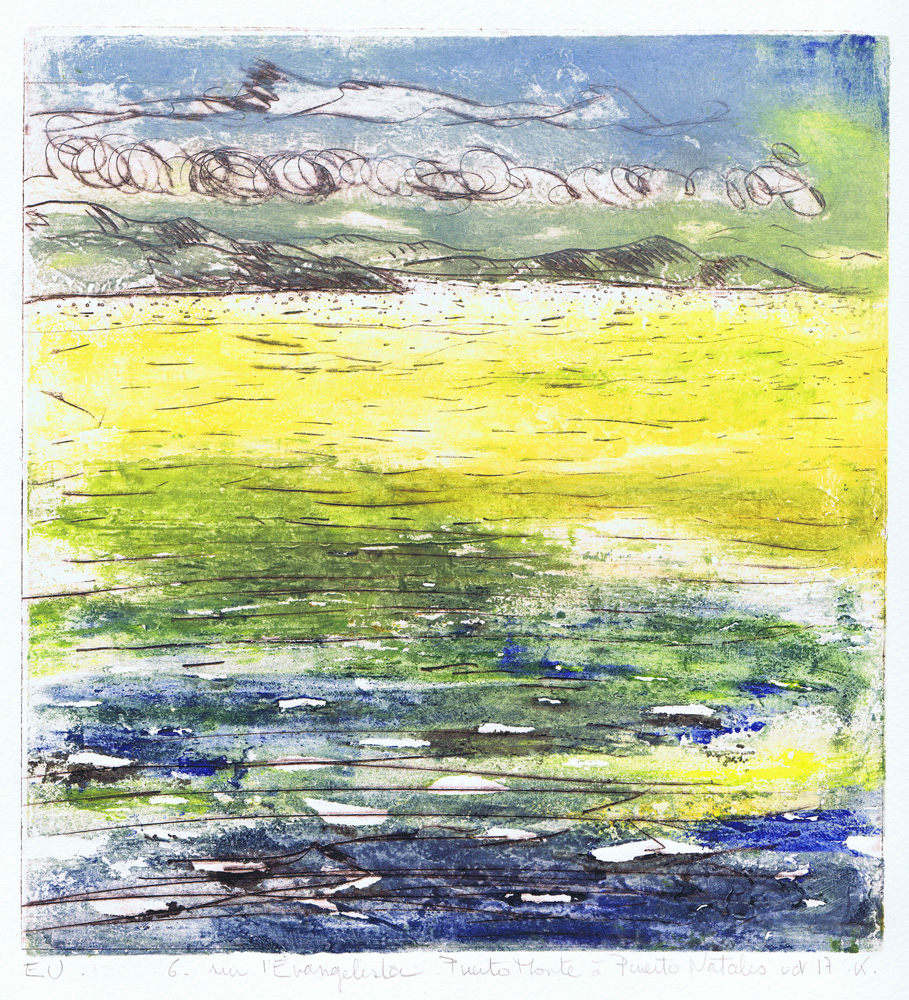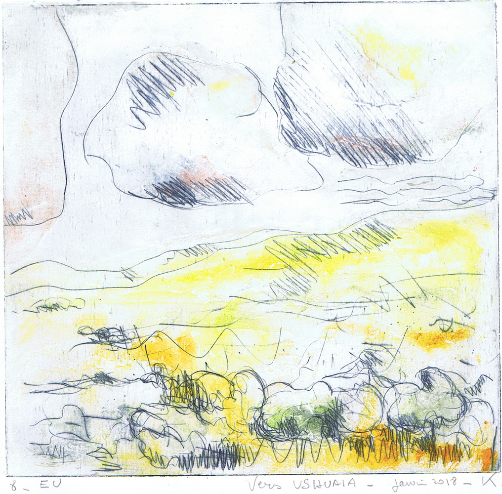 Ces gravures ont été réalisées à partir du carnet de voyage tenu en février mars 2017, sur les routes et canaux de Patagonie, parcourus en bus et bateaux, de Buenos aires à Ushuaia en passant par Mendoza, Santiago du Chili, Chiloé, Puerto Natales, Rio Gallegos, Punta Arenas et Porvenir.