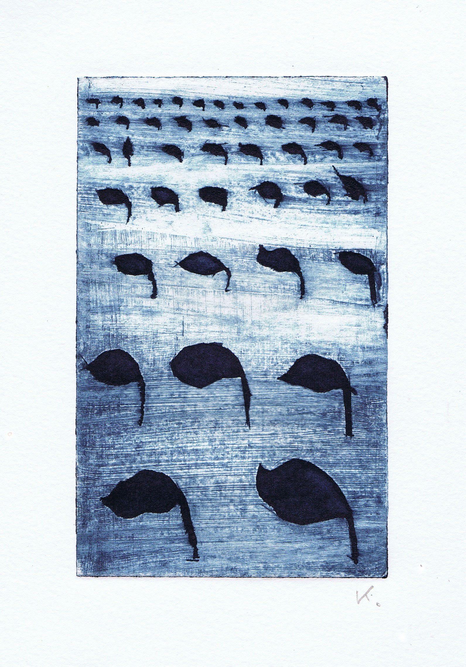 Collagravure + empreintes filet et plumes sur Canson édition 250 gr, 100 x 50cm